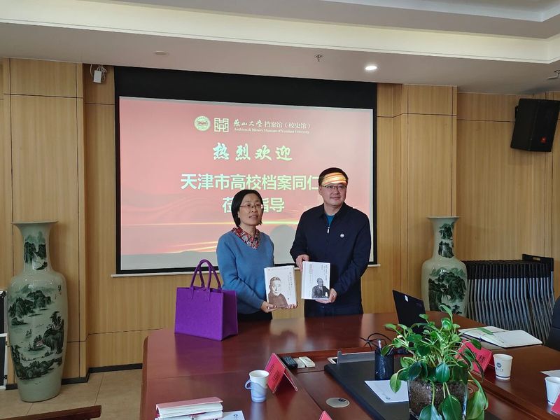 燕山大学档案馆馆长逯宝峰首先代表学校对学会一行表示热烈欢迎,介绍了燕山大学档案工作整体情况和高水平数字档案室建设工作。南开大学档案馆馆长袁伟代表天津高校档案同仁衷心感谢燕山大学档案馆的精心准备和细致讲解,并向燕山大学档案馆同仁赠送了《铅字流芳大先生——近代报刊中的张伯苓》《张彭春文集·日记卷》等南开特色档案编研成果。